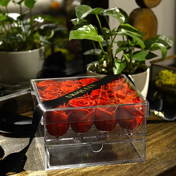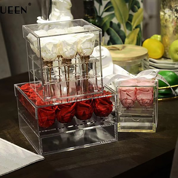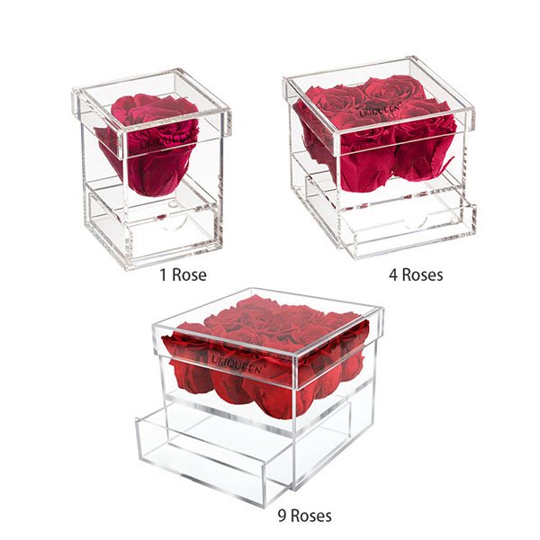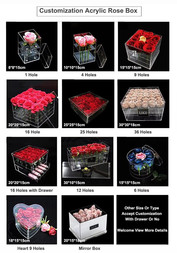 Multiple sizes available: 1 rose, 4 roses, 9 roses, 16 roses, 25 roses – fully customizable rose quantities and hole counts. 30+ colors including red, pink, purple, champagne, blue, black, rainbow + Pantone matching. Clear acrylic design with hidden drawer for rings, earrings, necklaces, and bracelets. Factory direct from Yunnan.