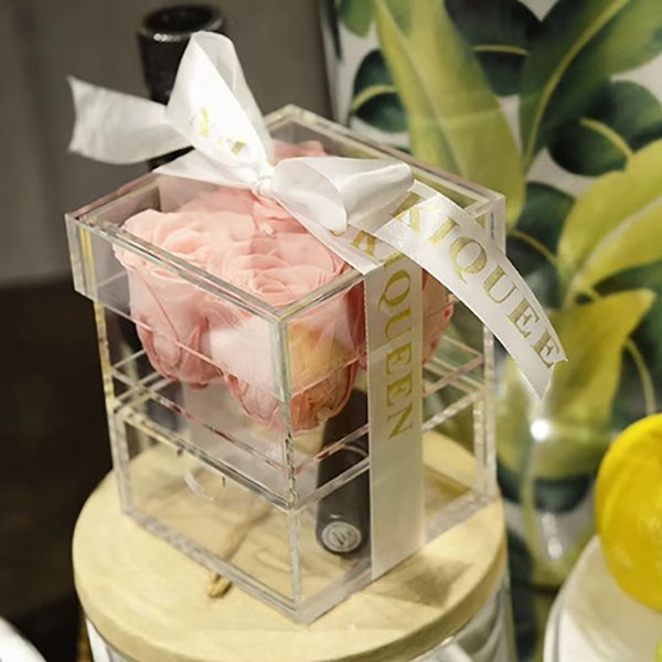 Personalized eternal rose acrylic jewelry box with preserved roses centerpiece • 100% A-grade roses preserved through professional dehydration and dyeing process, lasting 3–5 years without water or sunlight.