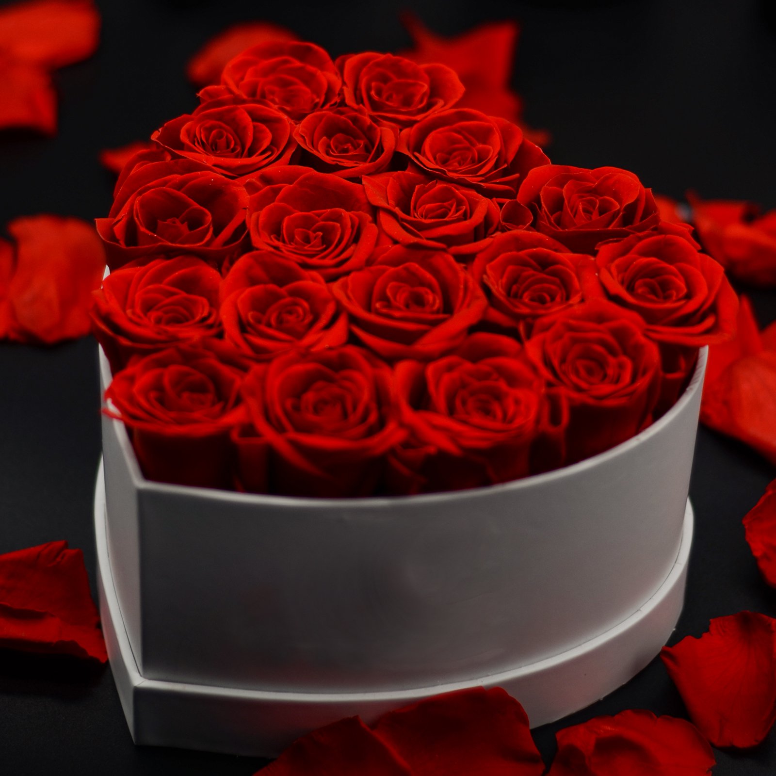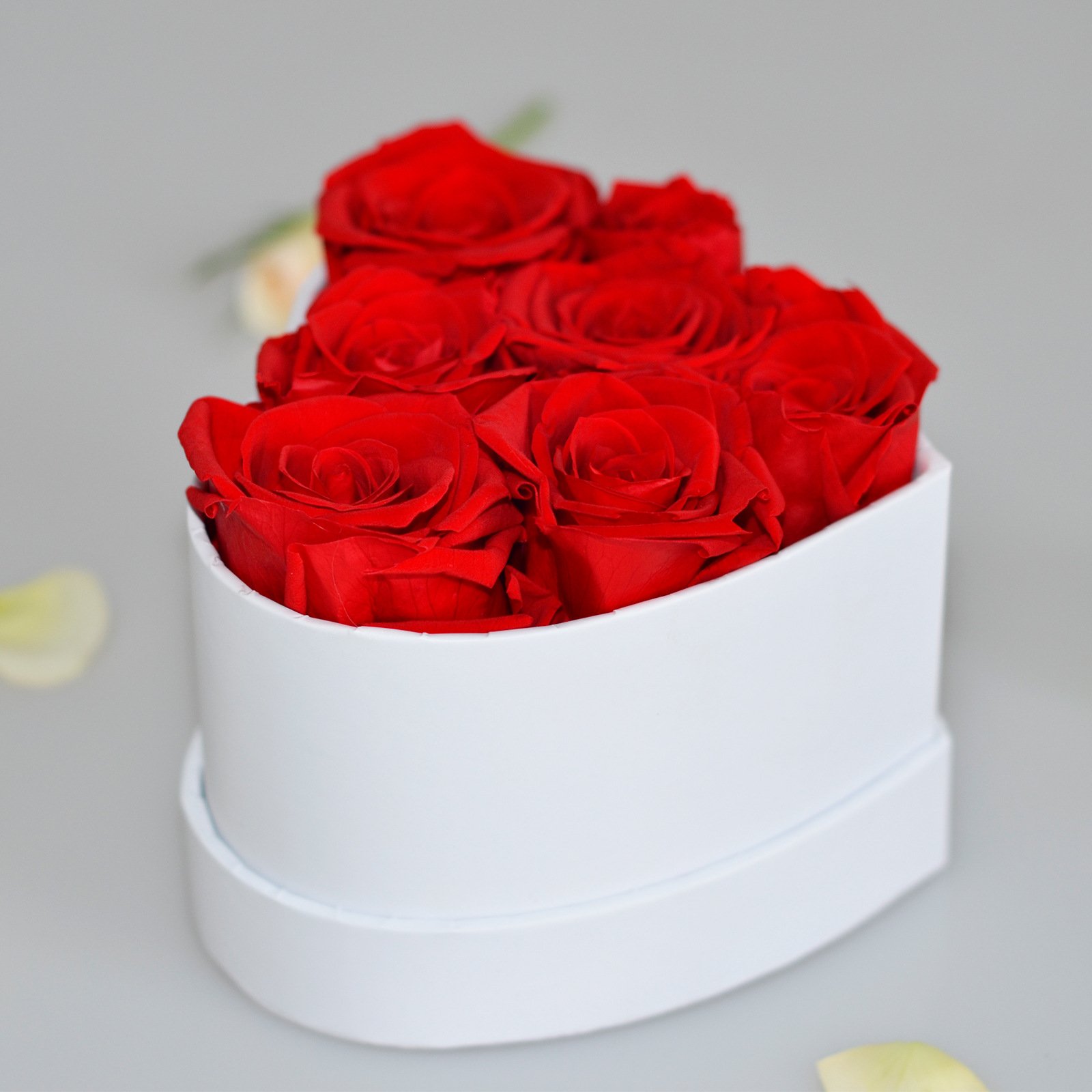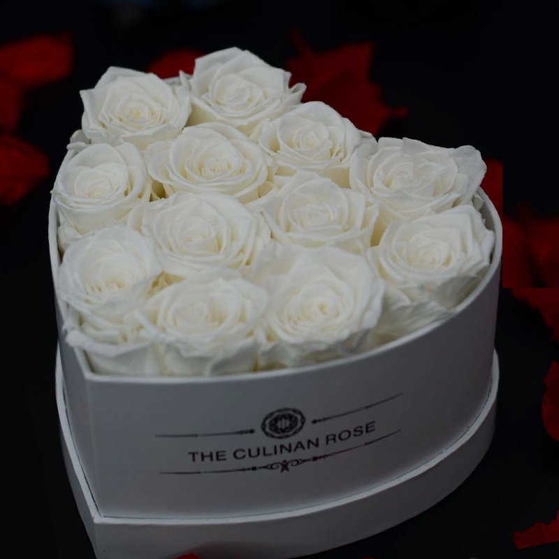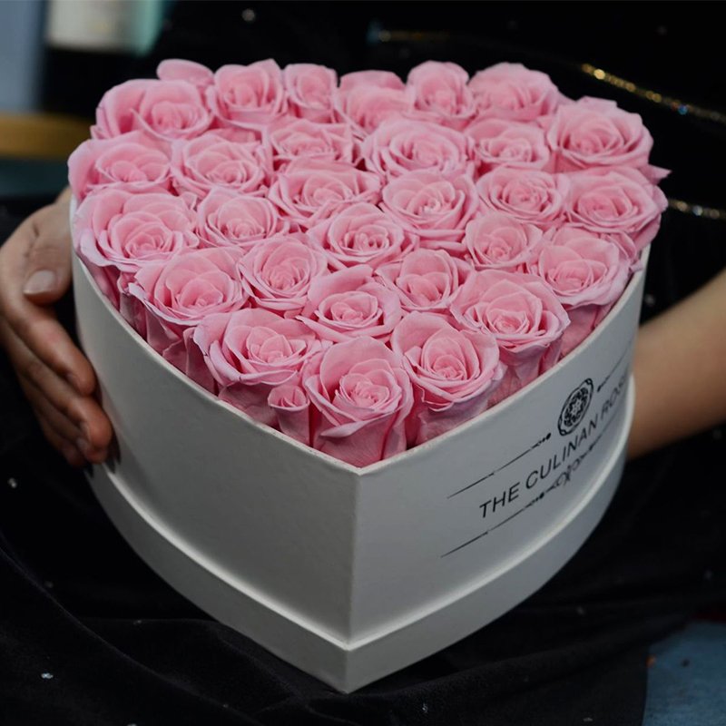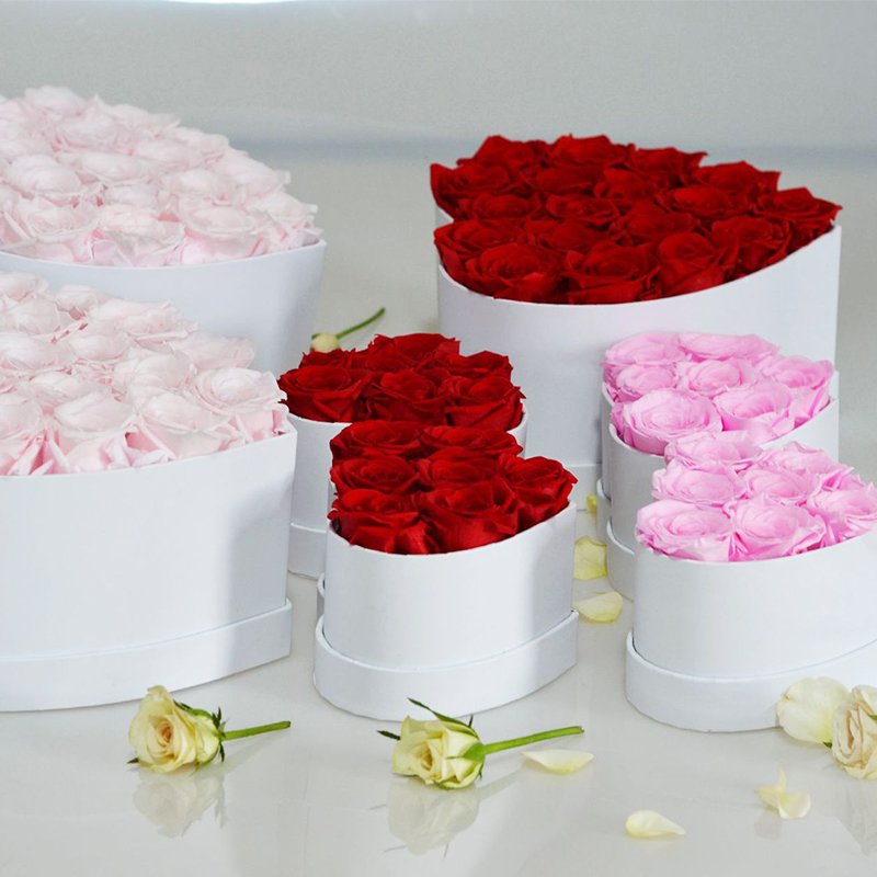 • Real preserved roses in heart, round, or square boxes