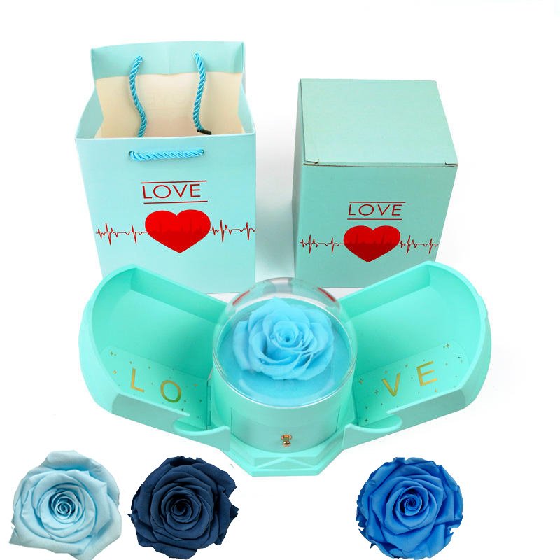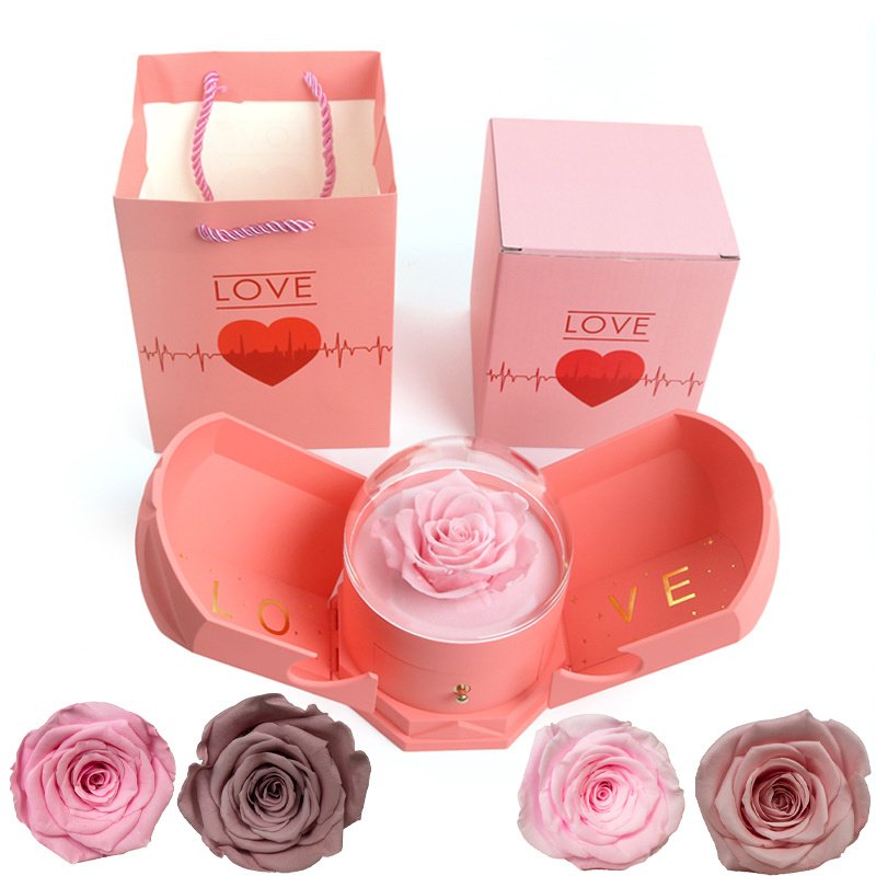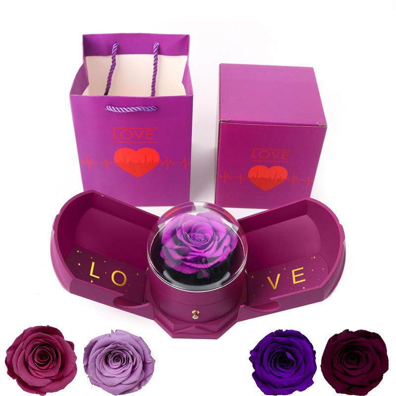 Romantic LOVE-shaped acrylic jewelry box with preserved rose centerpiece. A-grade real rose lasts 2–3 years, hidden drawer for jewelry, 5 colors (red, pink, purple, champagne, blue). Factory direct wholesale & full OEM.