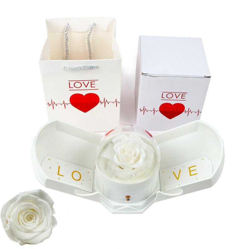 Elegant LOVE-shaped acrylic jewelry box featuring a real preserved rose centerpiece • 100% natural A-grade rose preserved through professional dehydration and dyeing process, lasting 2–3 years without any maintenance.