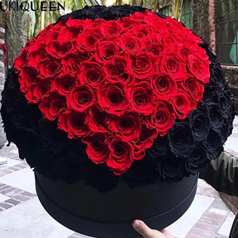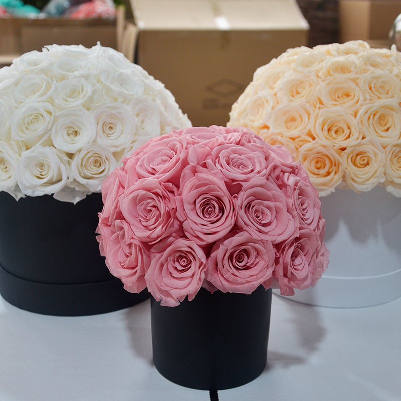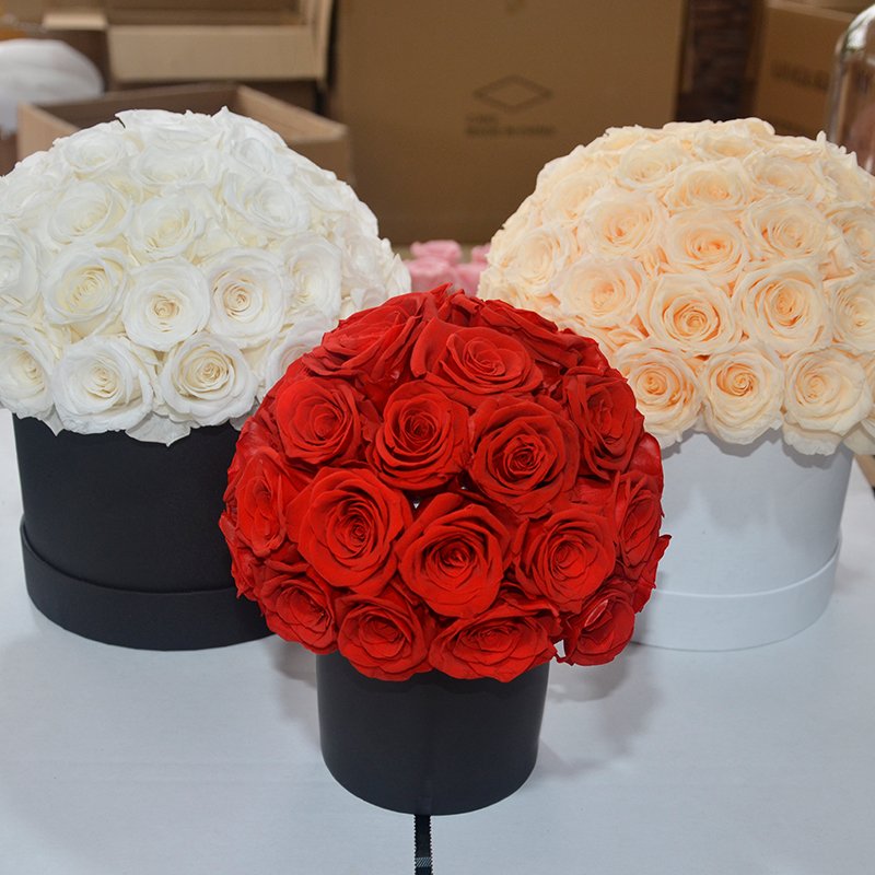 Preserved to last 2–3 years with natural soft touch and vivid color, no water or sunlight needed. 23–100 roses per box, multiple colors available, box color and material fully customizable.