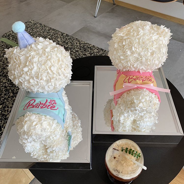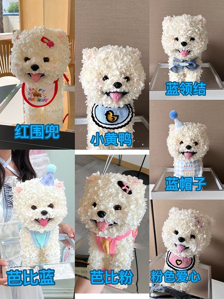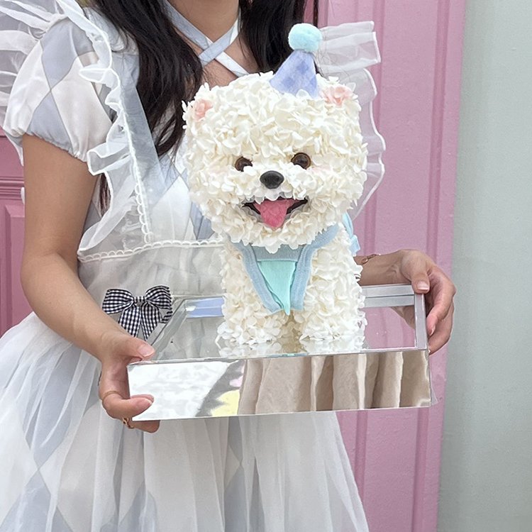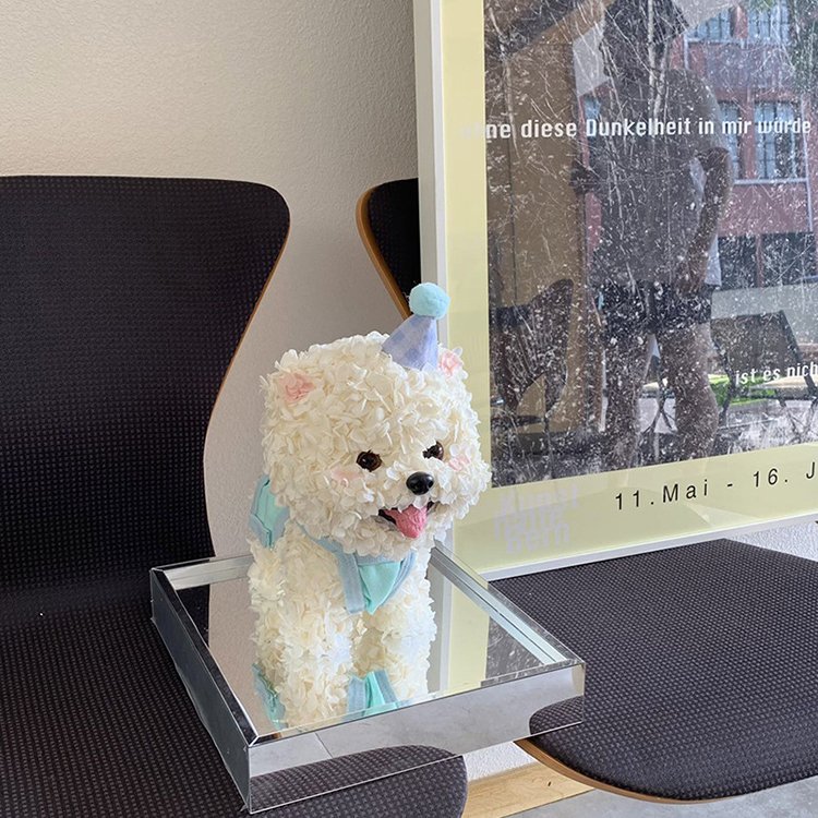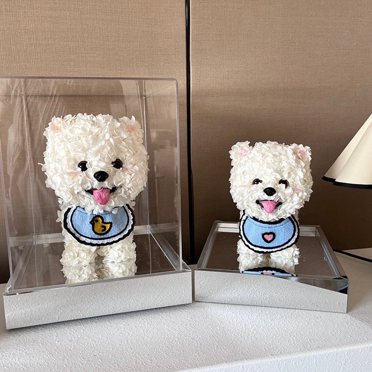 The cutest wholesale preserved flower Bichon Frise puppy – handcrafted entirely with premium preserved hydrangea flowers (100–150 blooms) to create an adorable, fluffy 3D puppy shape with charming details: hat, bib, bow, tongue, and playful expression. Each piece is 100% natural and professionally preserved to stay vibrant and soft for 3–5 years – no watering, no sunlight required.
