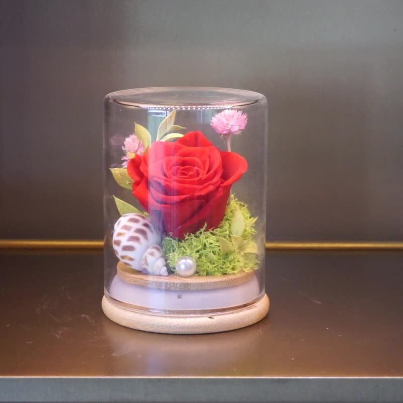 Searching for a unique, romantic gift with a touch of the sea? This Mini Red Preserved Rose in Glass Dome is a masterpiece of miniature floristry. It features a passionate A-grade red preserved rose, artistically arranged with a natural spotted sea shell (conch), a shimmering faux pearl, and delicate pink globe amaranth accents on a bed of lush green moss.