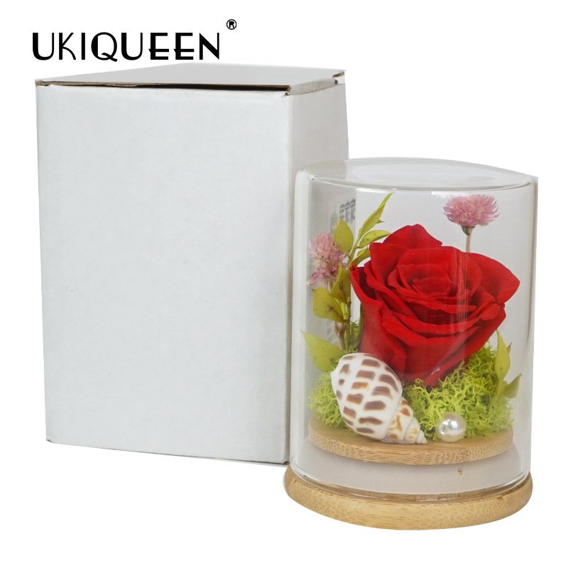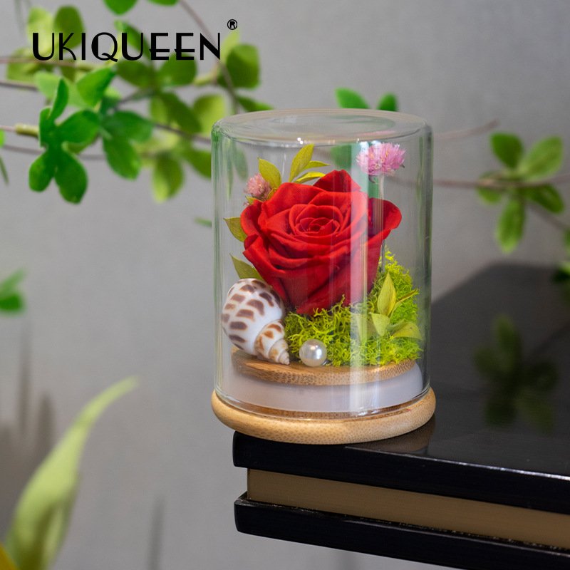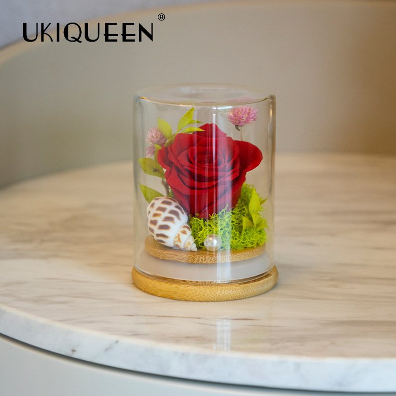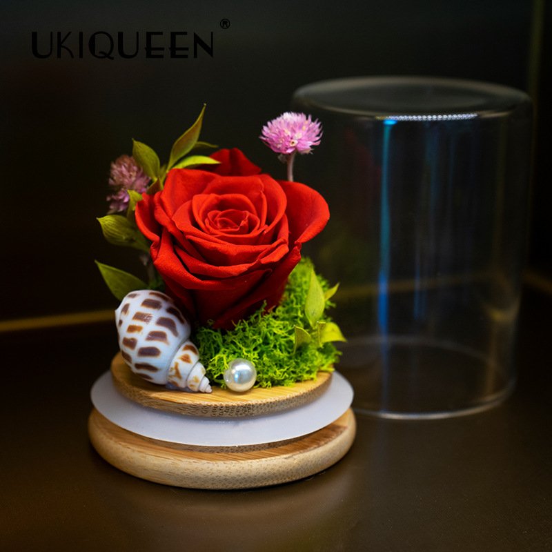 Standing at a petite 8.5 cm height, this design evokes the “Little Mermaid” aesthetic—symbolizing deep, enduring love. It is housed in a high-clarity borosilicate glass dome on a smooth bamboo base. Unlike standard floral gifts, this ocean-themed piece creates a distinctive, fairy-tale atmosphere perfect for weddings, parties, or desktop decor.