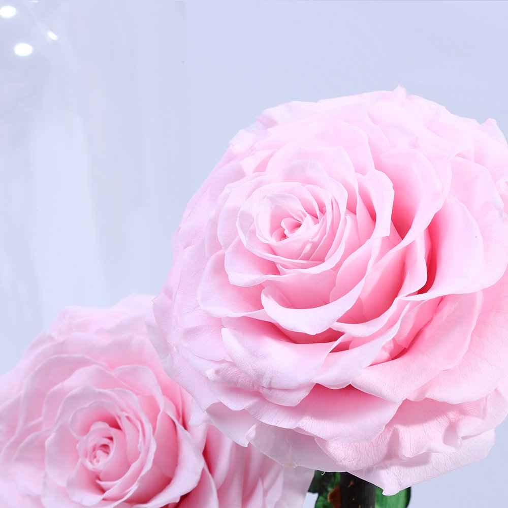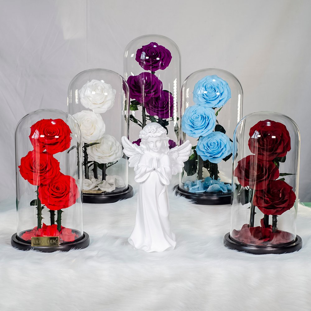 Large 8–10cm heads with realistic stems under crystal-clear dome, optional LED lighting. 30+ colors available, crafted in Yunnan factory.