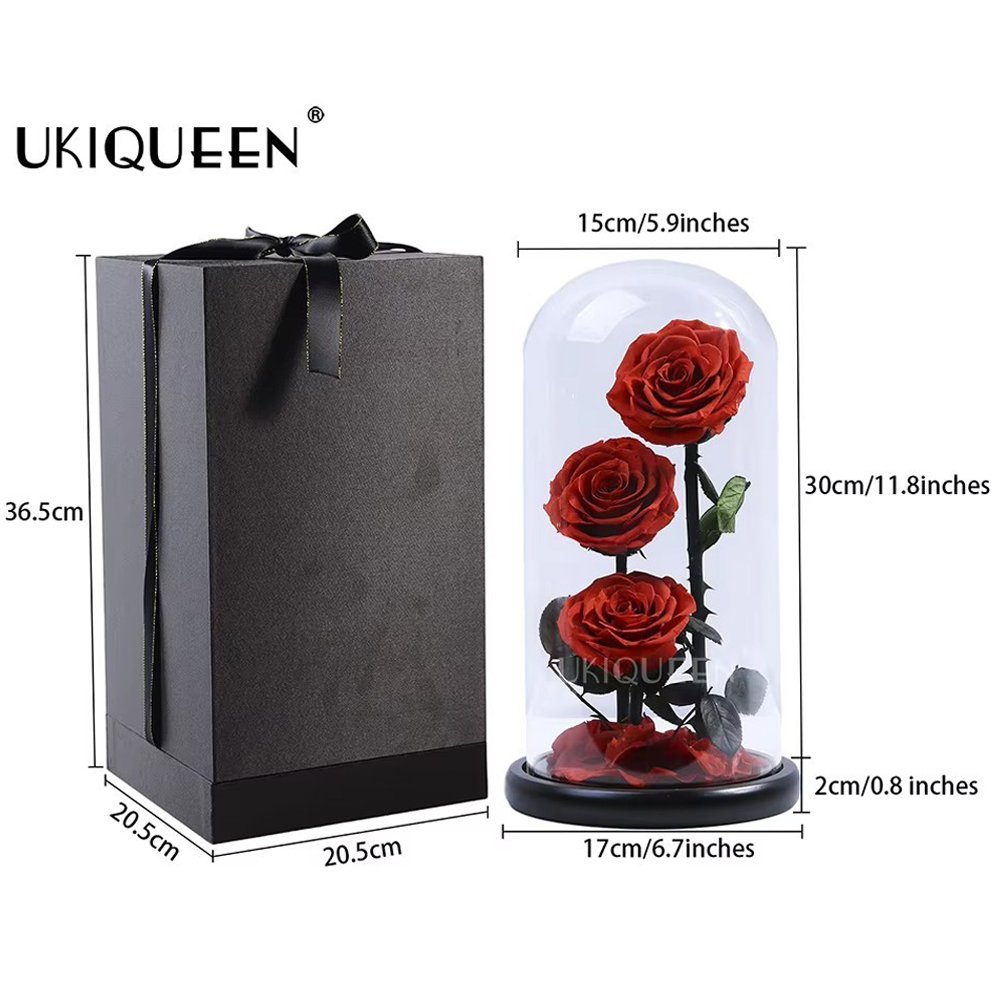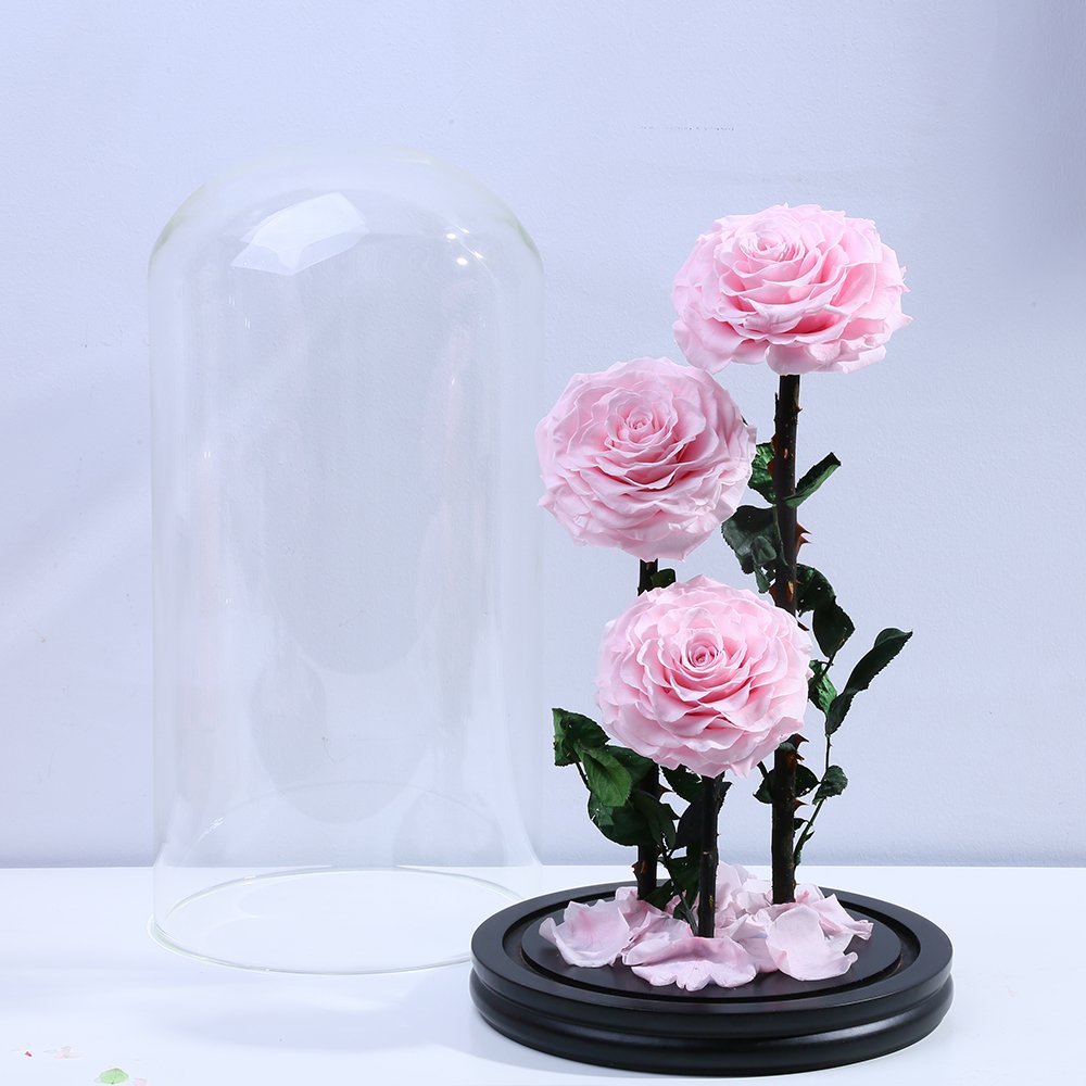 Elegant preserved 3-rose in glass dome featuring natural stems • 100% real A-grade roses preserved for 2–3 years through professional dehydration and dyeing process.