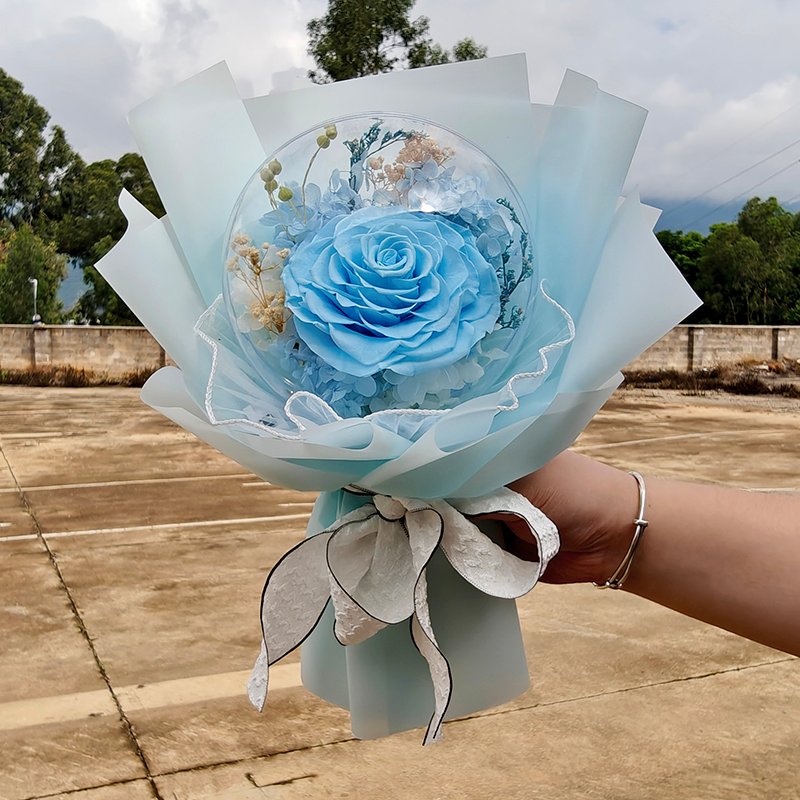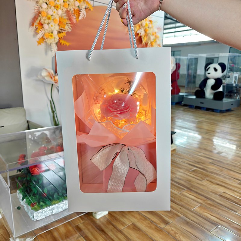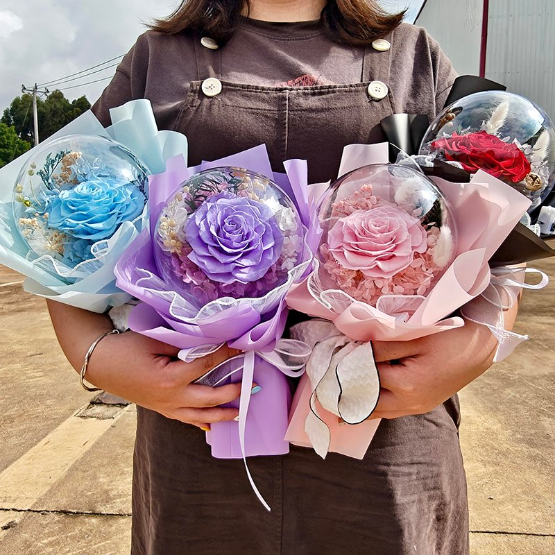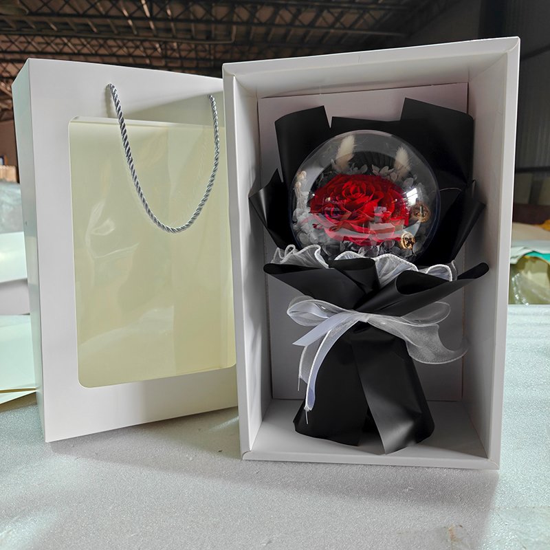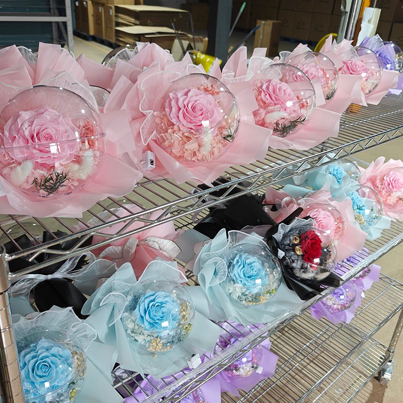 Factory direct from Yunnan preserved flower base. Full OEM/ODM supported: custom rose color, balloon fillers, wrapper design, LED light color, logo printing on wrapper/gift bag/ribbon, exclusive packaging design, private label branding. Low MOQ, mixed colors in one order accepted, video inspection before shipment.