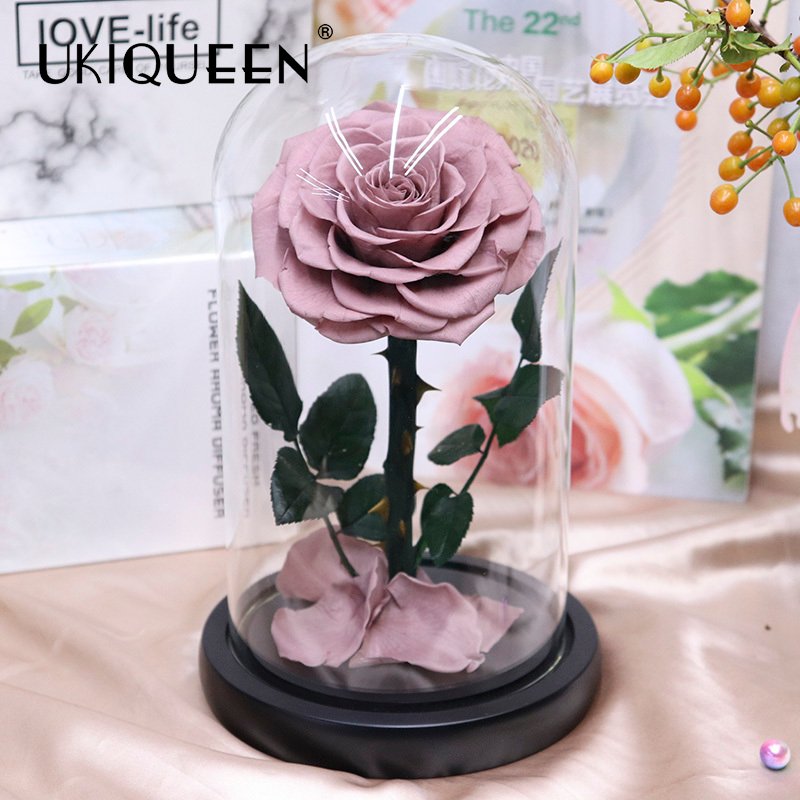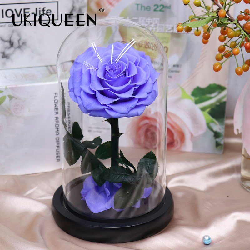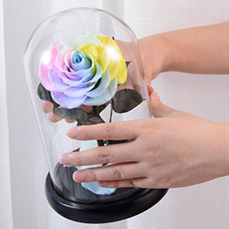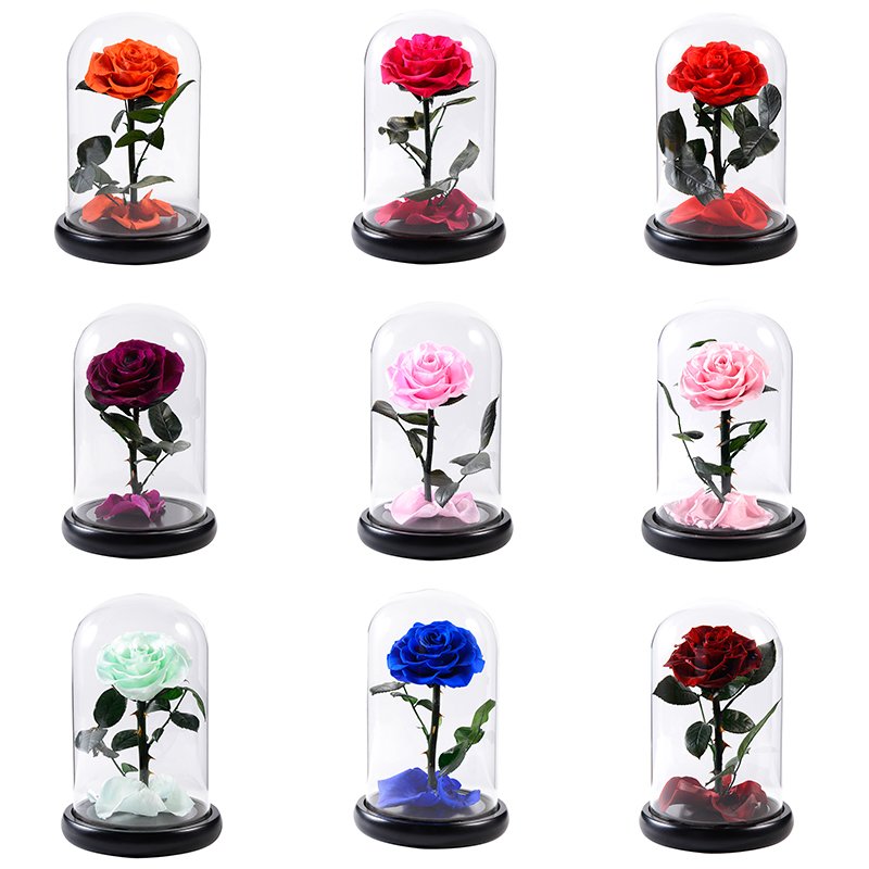 High-clarity glass cover, 7–8cm rose heads, 30+ colors available, optional LED base with warm starry lights.