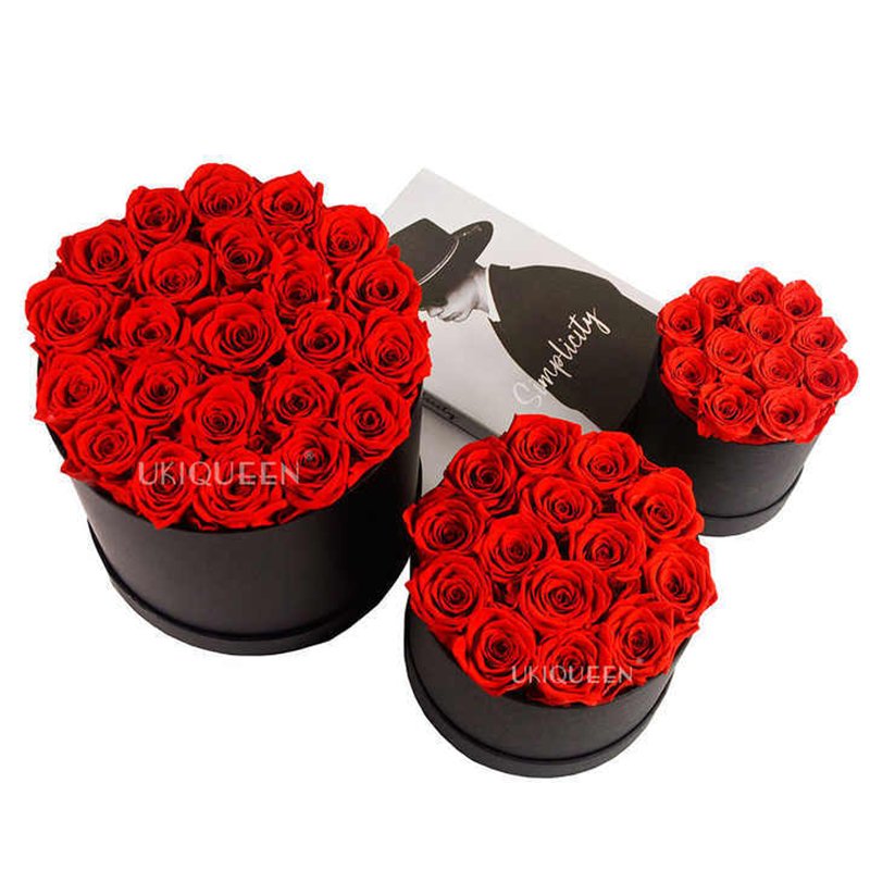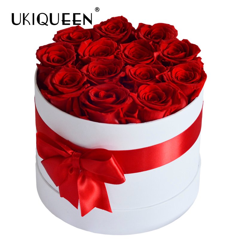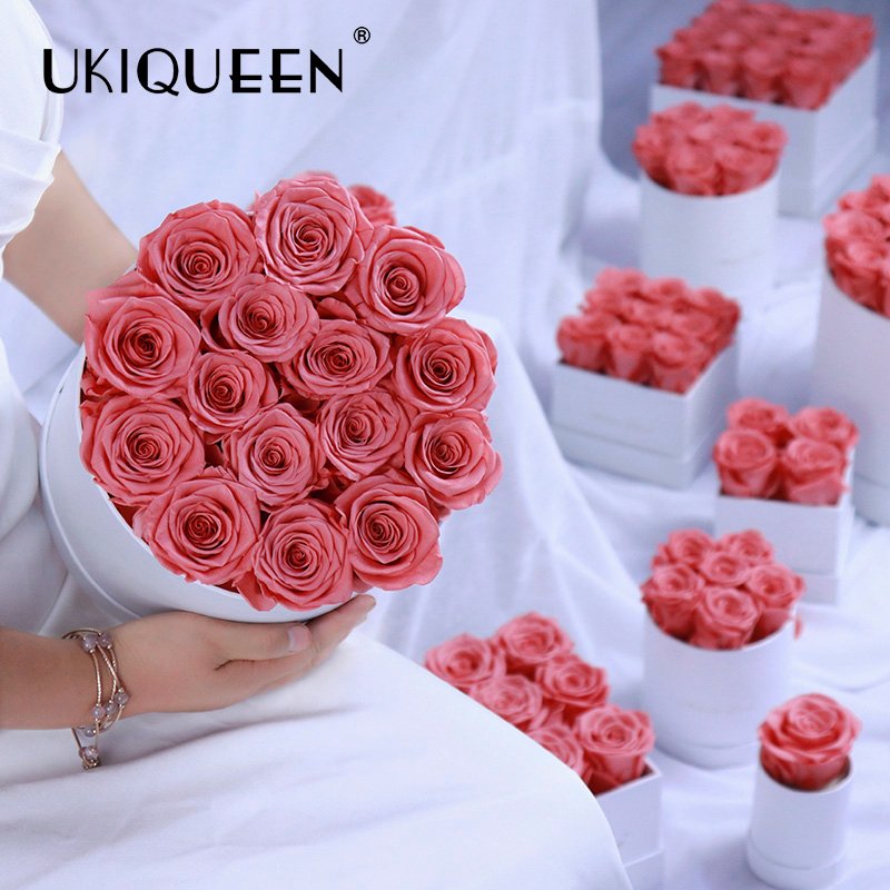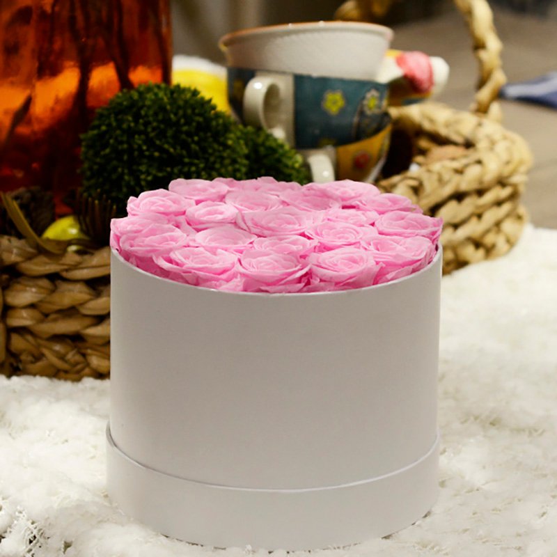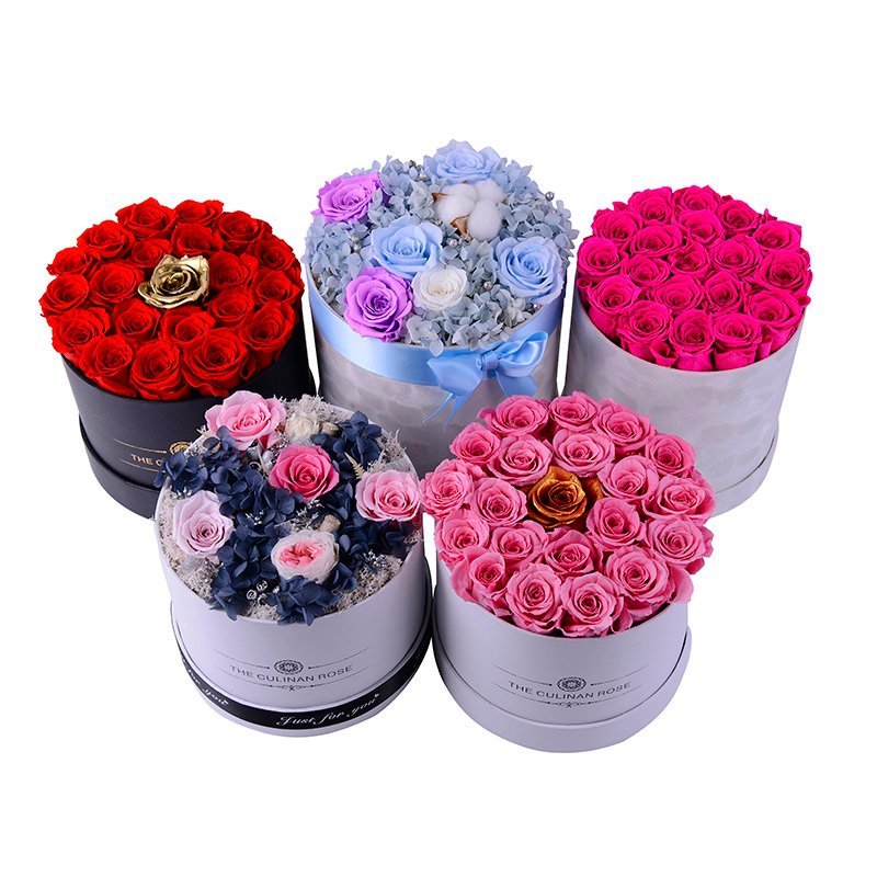 Premium A-grade preserved roses in elegant round gift boxes • 100% real natural fresh roses, dehydrated, bleached, dried, and dyed for everlasting beauty.