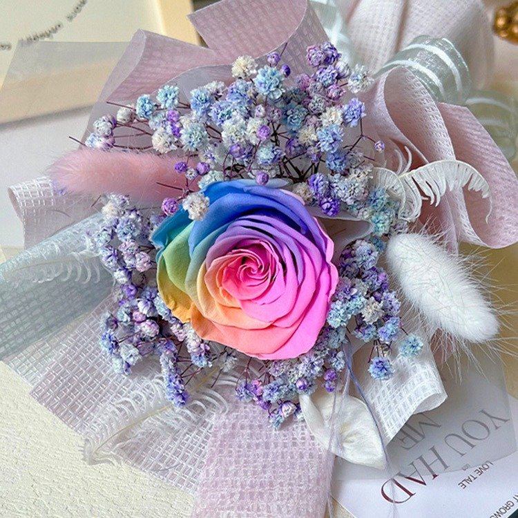 One 100% real A-grade preserved rose (flower head diameter 4–5 cm) professionally preserved through dehydration and dyeing process, lasting 3–5 years without any water or sunlight. Hand-arranged with premium preserved baby’s breath, bunny tails, ferns, limonium and other natural dried flowers to create an elegant and full appearance. Wrapped in high-end textured art paper and finished with luxurious satin/organza ribbon bow. Comes complete with a rigid high-quality gift box and decorative ribbon – ready to gift straight out of the package.