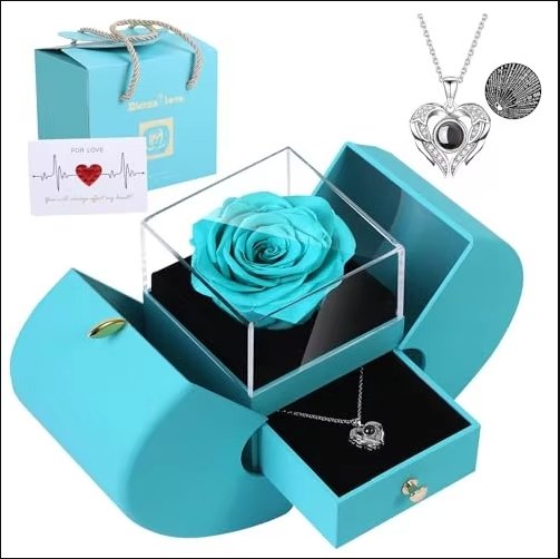 - Design: Premium acrylic box with preserved rose centerpiece