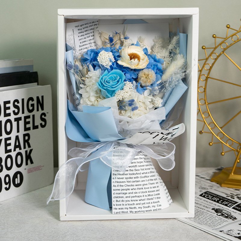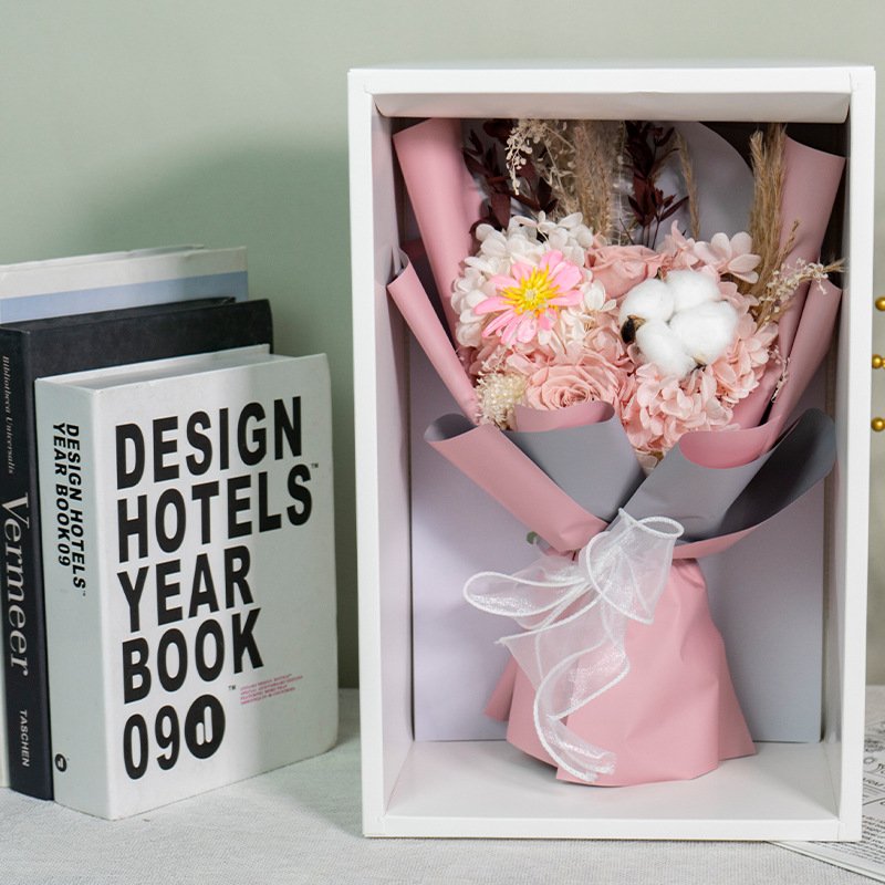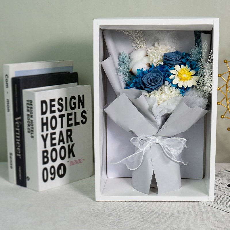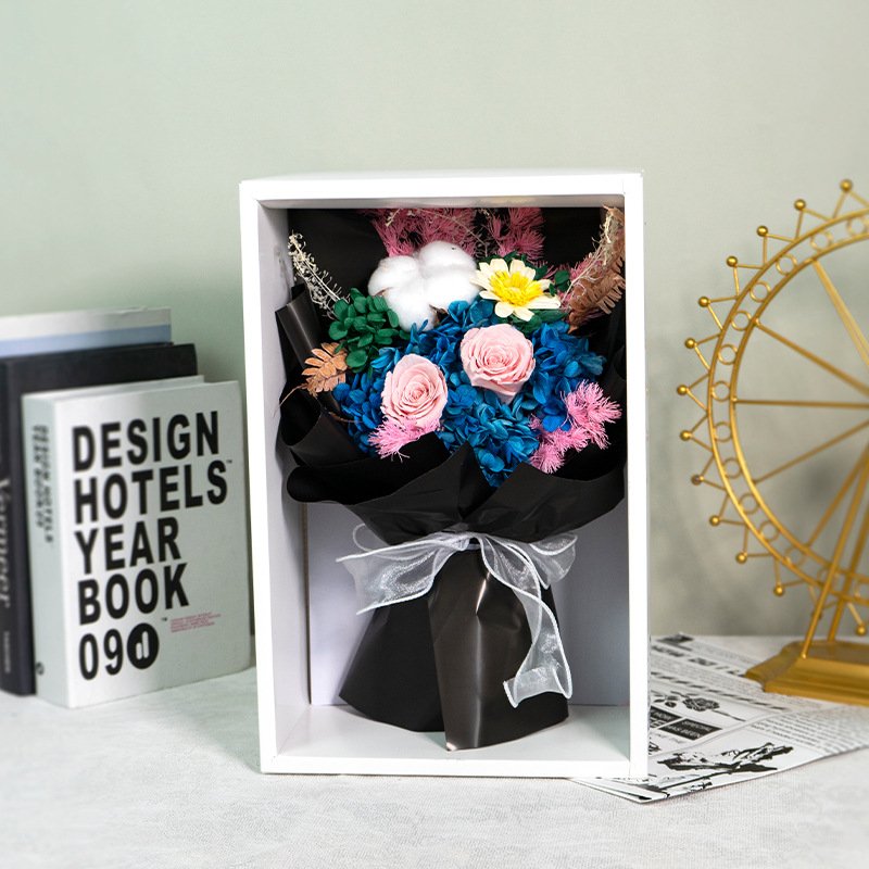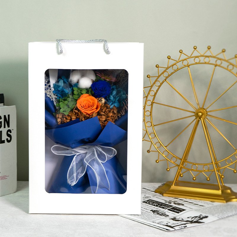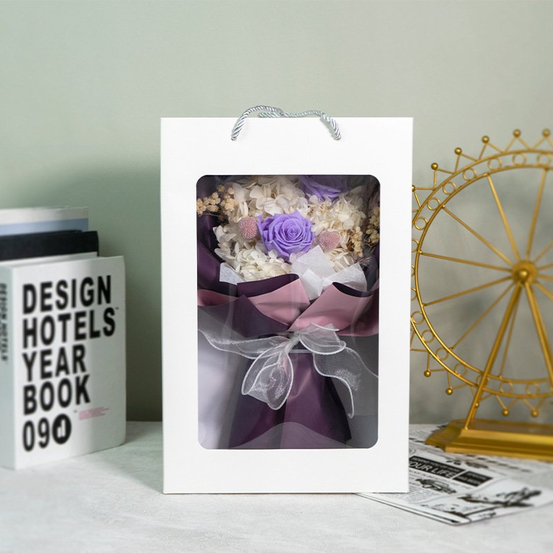Wrapped in multi-layer high-end textured paper with misty veil and finished with a luxurious satin ribbon bow. Presented in a premium white gift box with transparent window and sturdy rope handles – perfect for gifting or display right out of the package.